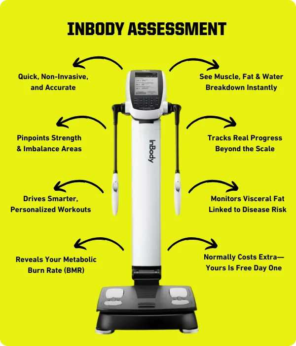 The InBody Scan is a quick, non-invasive assessment that measures body composition—like muscle mass, body fat, and water balance. It gives you a clearer picture of your health than a scale ever could. It also helps us design a plan that truly works for your body.